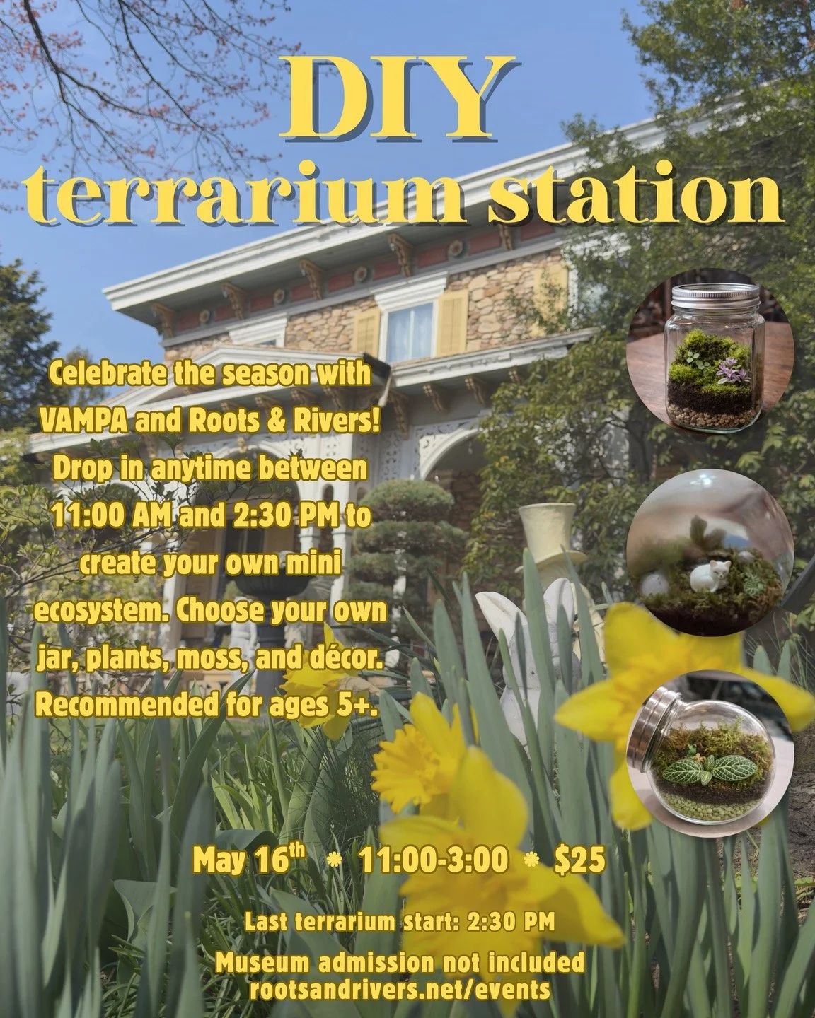 Join us for a lovely spring afternoon with Roots & Rivers, who will host a DIY Terrarium Station outside the museum on Saturday, May 16th, from 11:00 am-3:00 pm.